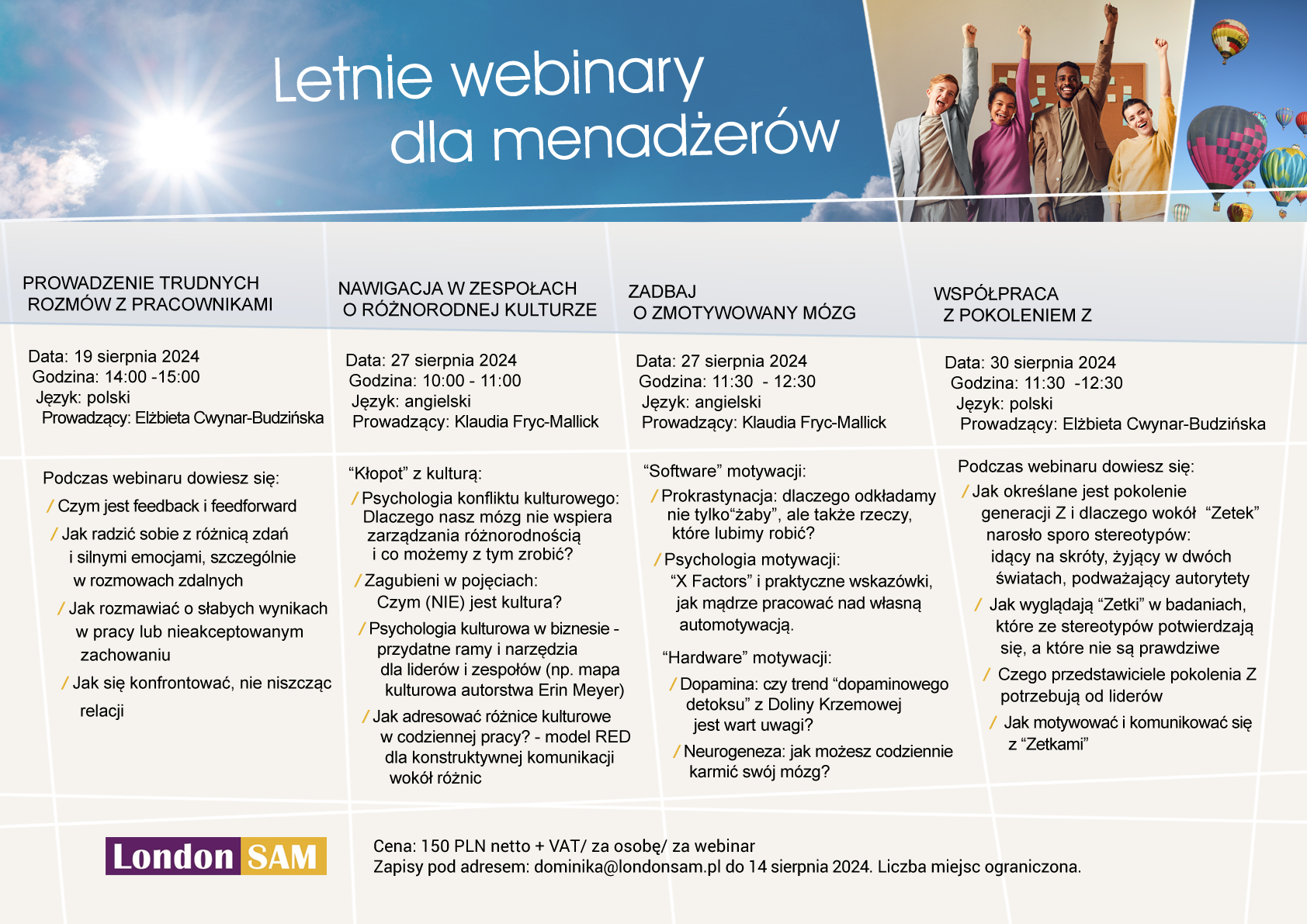 Zapraszamy do kontaktu: dominika@londonsam.pl oraz zapoznania się ze szczegółową ofertą.