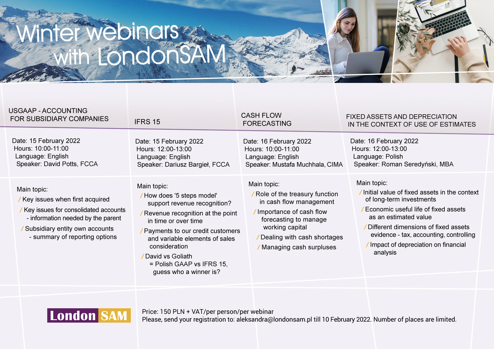 Zapraszamy na drugą edycję webinarów, którą przygotowaliśmy specjalnie dla Państwa. Wśród omawianych tematów znajdą się: USGAAP – Accounting for subsidiary comapnies, Revenue Recognition 'IFRS 15′, Cash Flow Forecasting oraz Fixed assets and depreciation in the context of use of estimates.