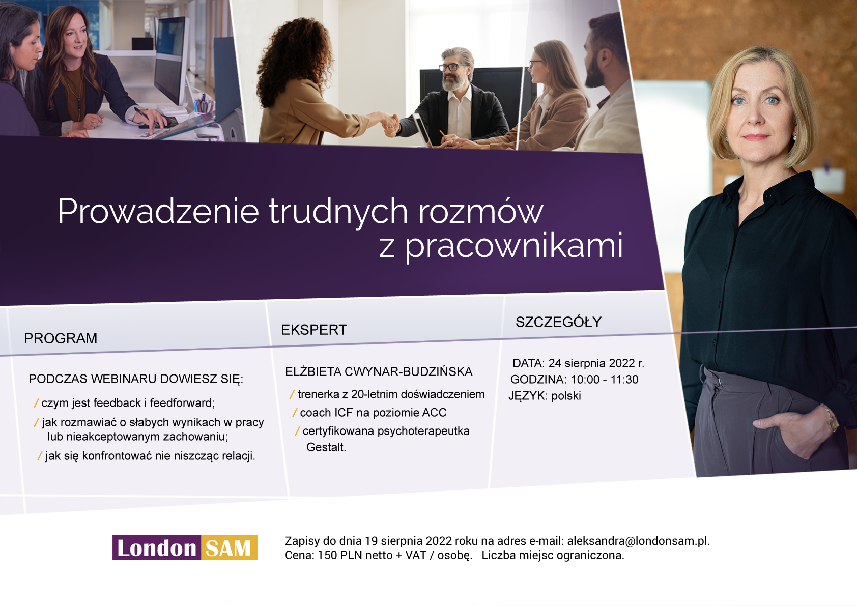 Zapraszamy na webinar dla liderów i menadżerów „Prowadzenie trudnych rozmów z pracownikami”, który odbędzie się 24 sierpnia 2022 roku, w godzinach 10.00-11.30. Zapisy do dnia 19 sieprnia 2022 r. pod adresem e-mail: aleksandra@londonsam.pl.
